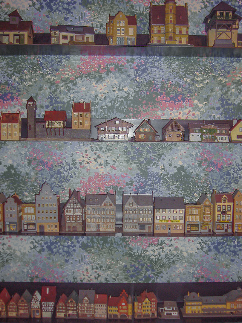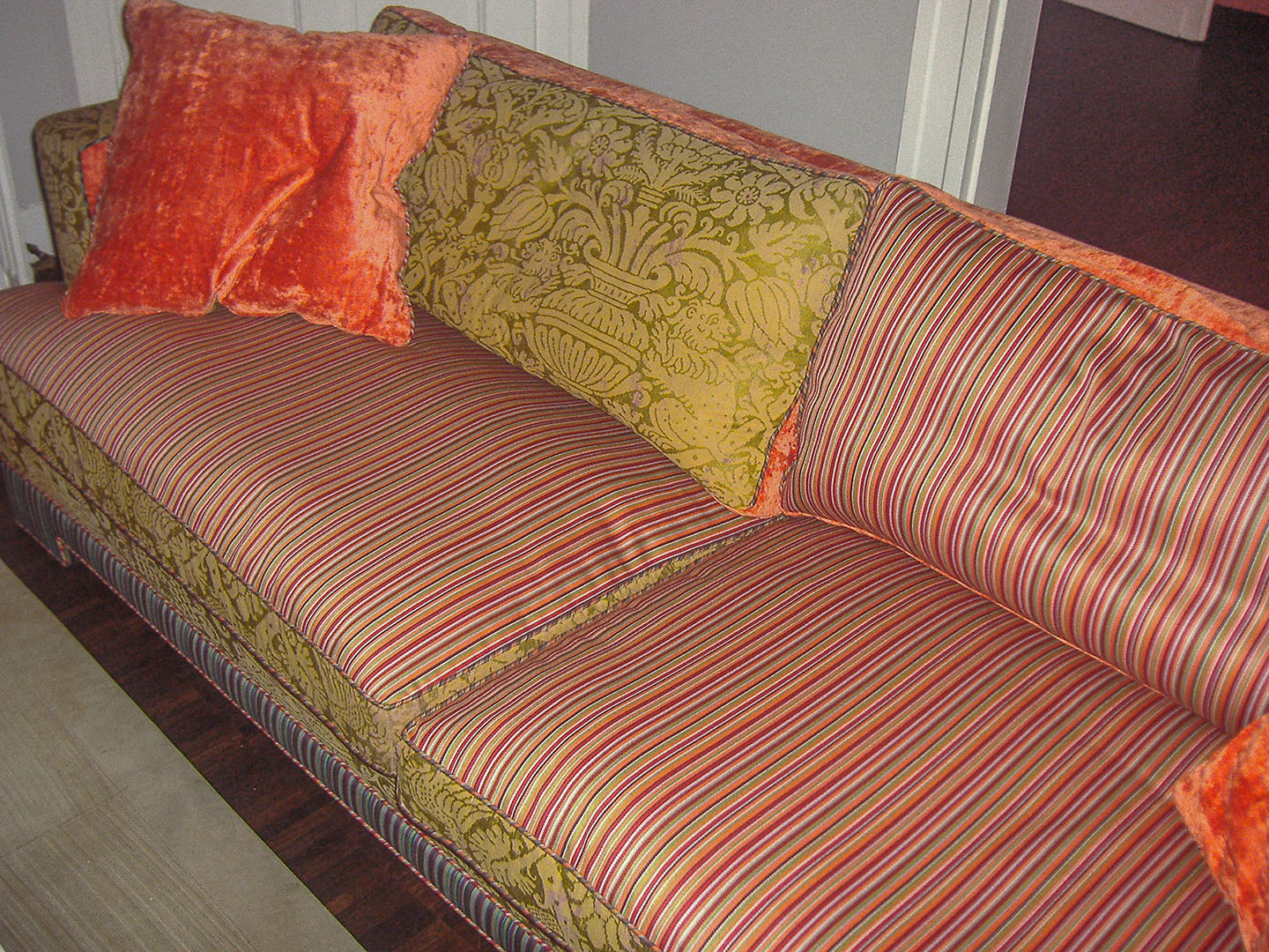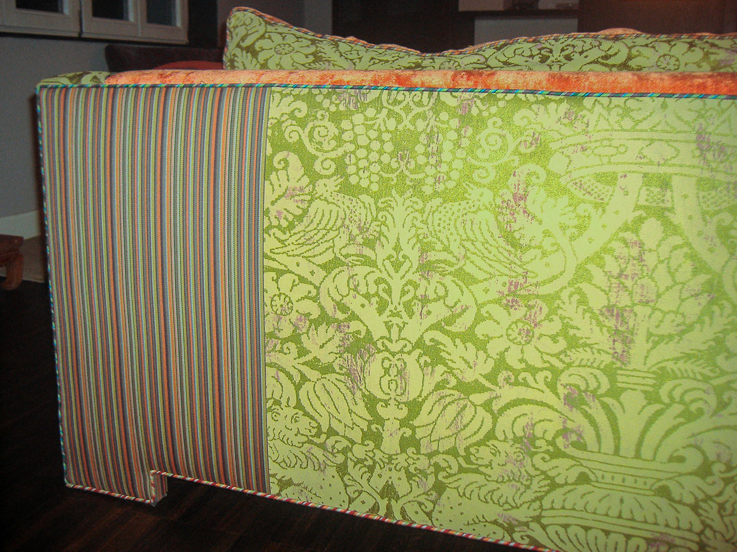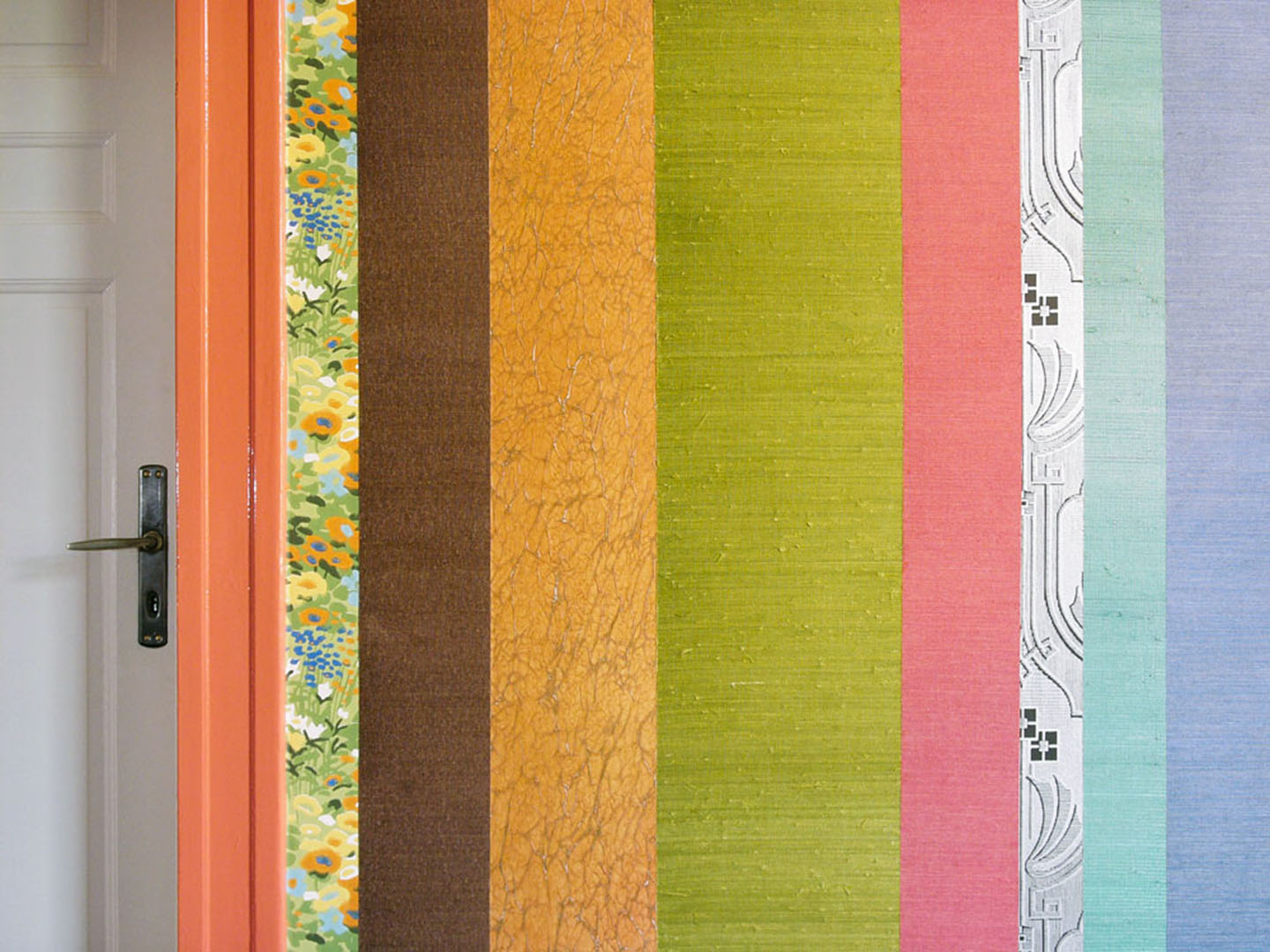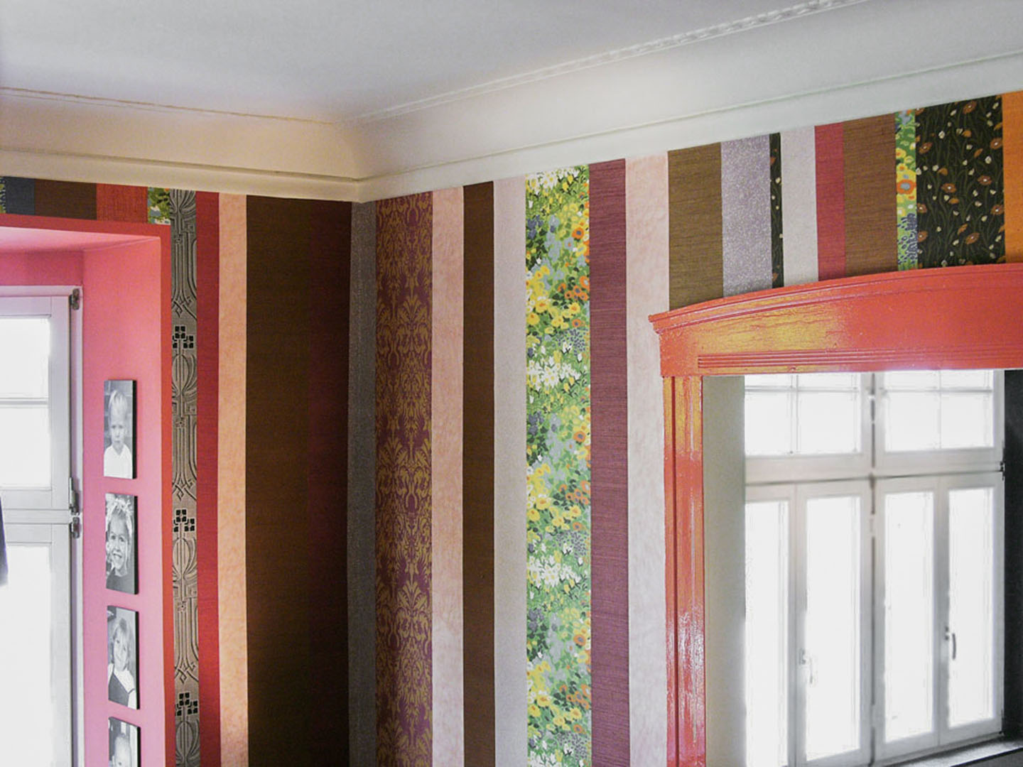 Redevelopment; colour, structure and pattern concept as requested, wallpaper mashups, insertion of eccentric collegtions; prototype "Long Paul"- sofa as matter- mashup (Fortuny, Paul Smith)